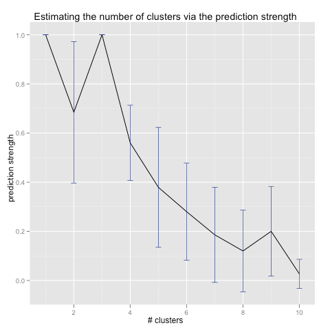 In practice, I tend to prefer using the gap statistic algorithm, since it’s a little easier to code and it doesn’t require selecting an arbitrary threshold like the prediction strength does. I’ve also found that it gives slightly better results (though the original prediction strength paper has the opposite finding).
