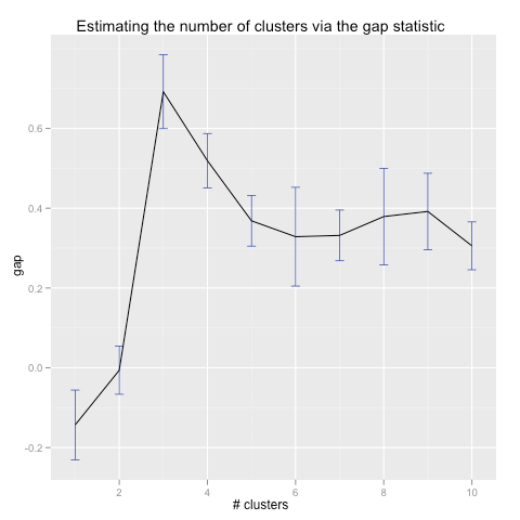 And running the gap statistic algorithm, we see that it correctly detects the number of clusters to be three: